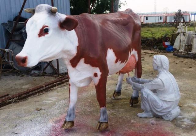 Fiberglass inek ve süt sağan kadın heykeli, birebir boyutlardadır.